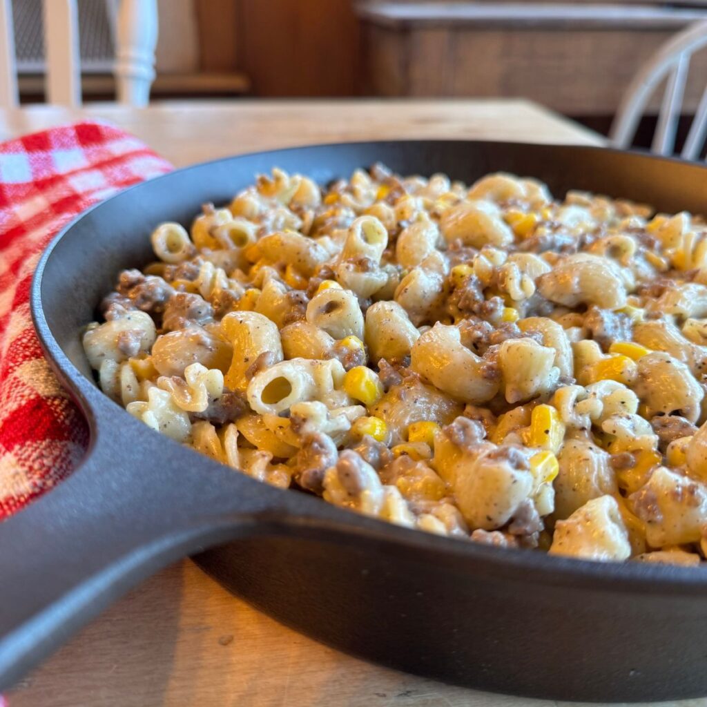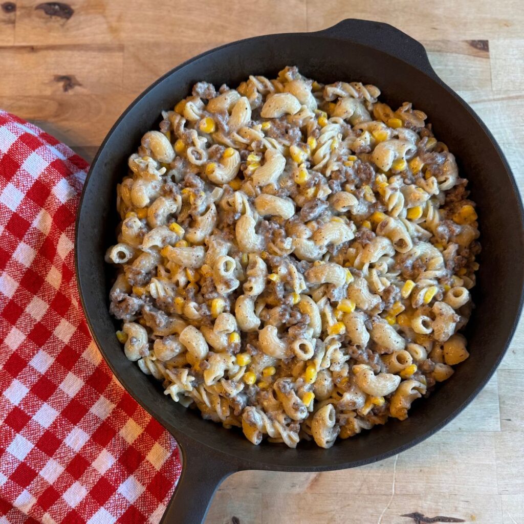 Add the cooked pasta, browned beef, and frozen corn. Stir until well combined and heated through. - Serve and Enjoy