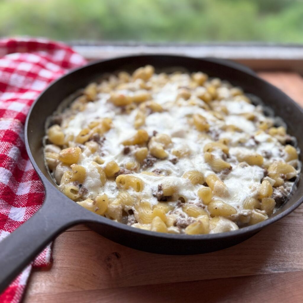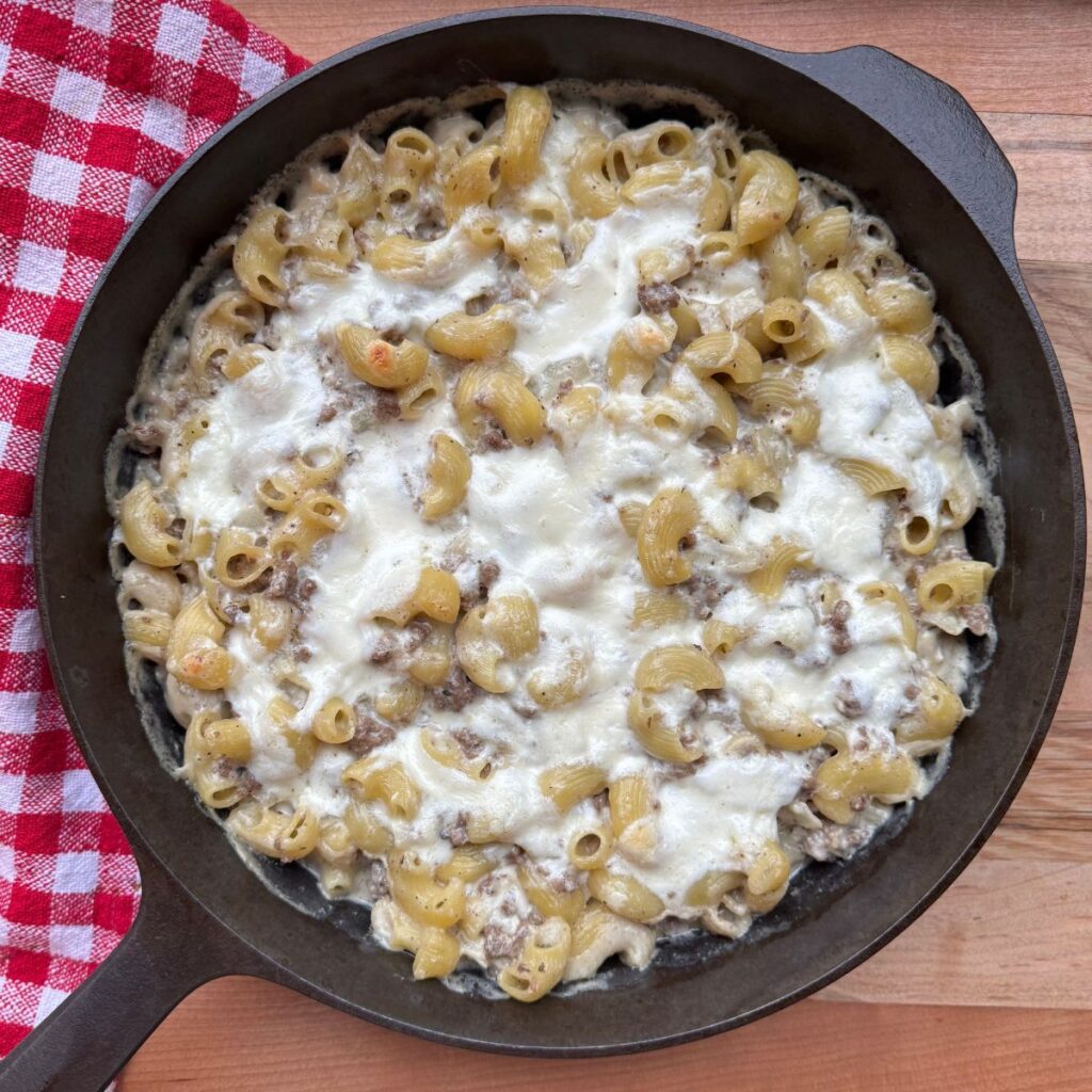 Boil pasta in salted water until just al dente. Drain and set aside. - Brown the Beef: